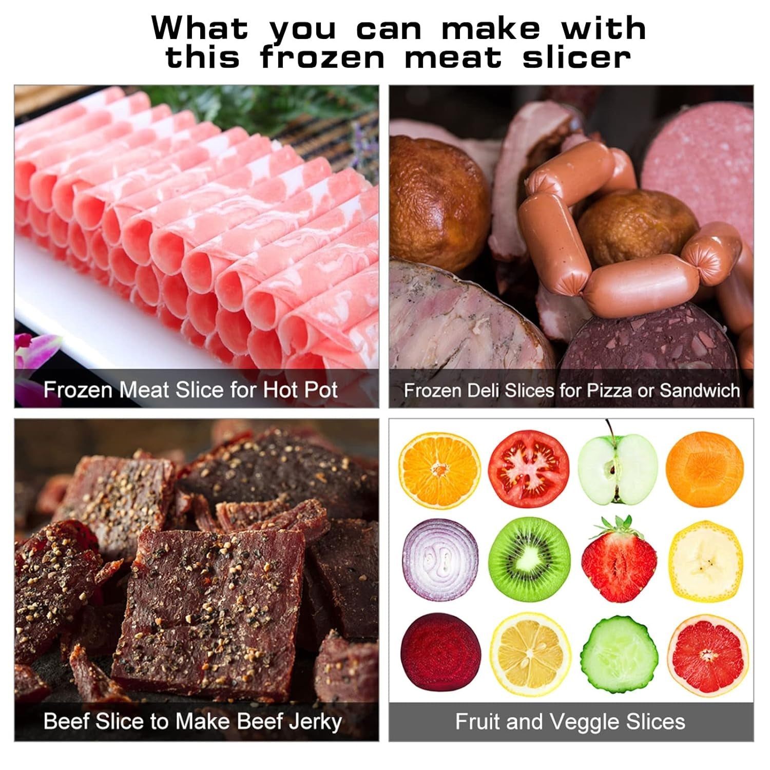 - It helps to cut frozen meat into various uses, including making hot pot, sukiyaki, pizza toppings, sandwiches, or ginger.