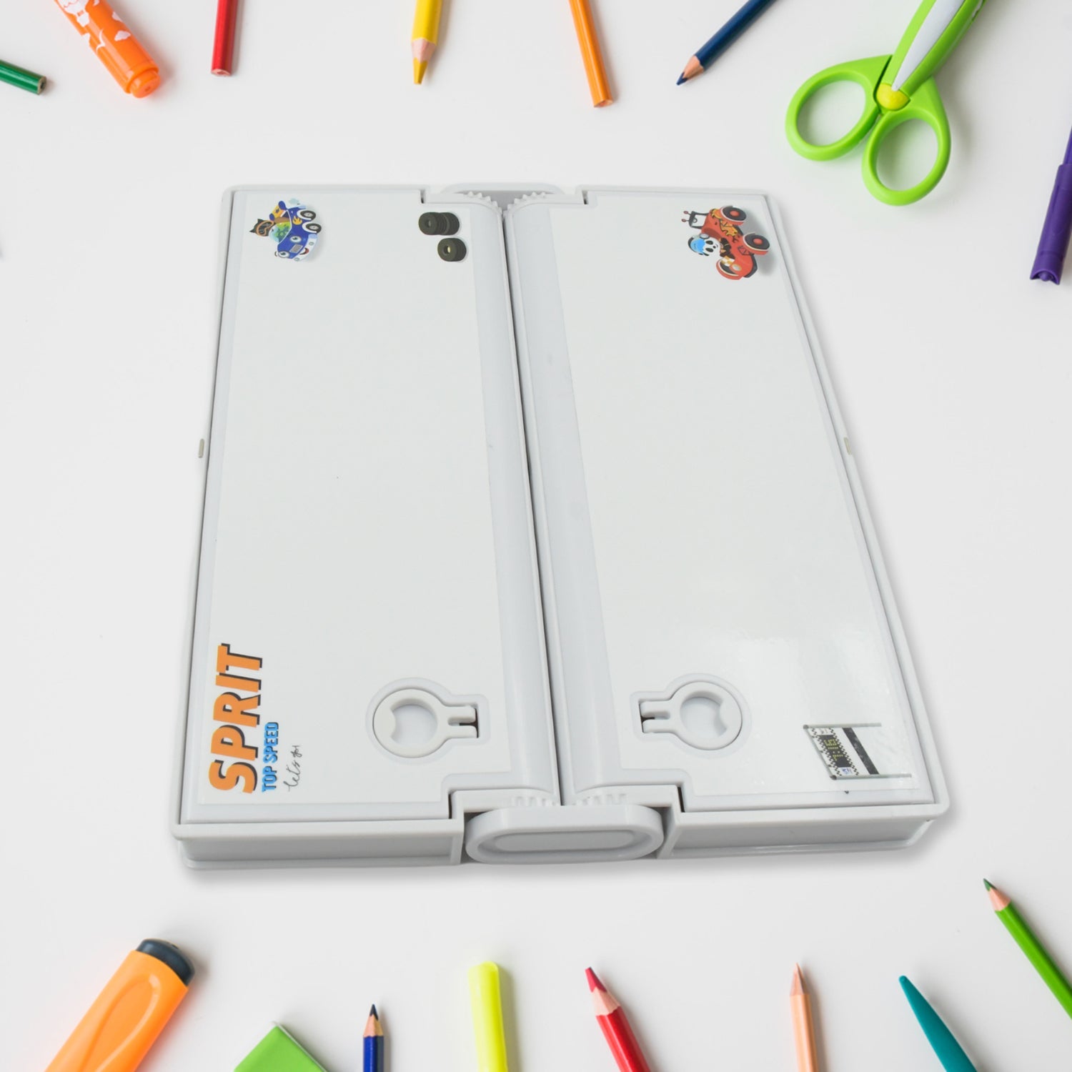 8858 360 Degree Rotating Pencil Box With White Board Marker And Duster 2 Compartment Box Sharpener & Calculator Best Gift For Student