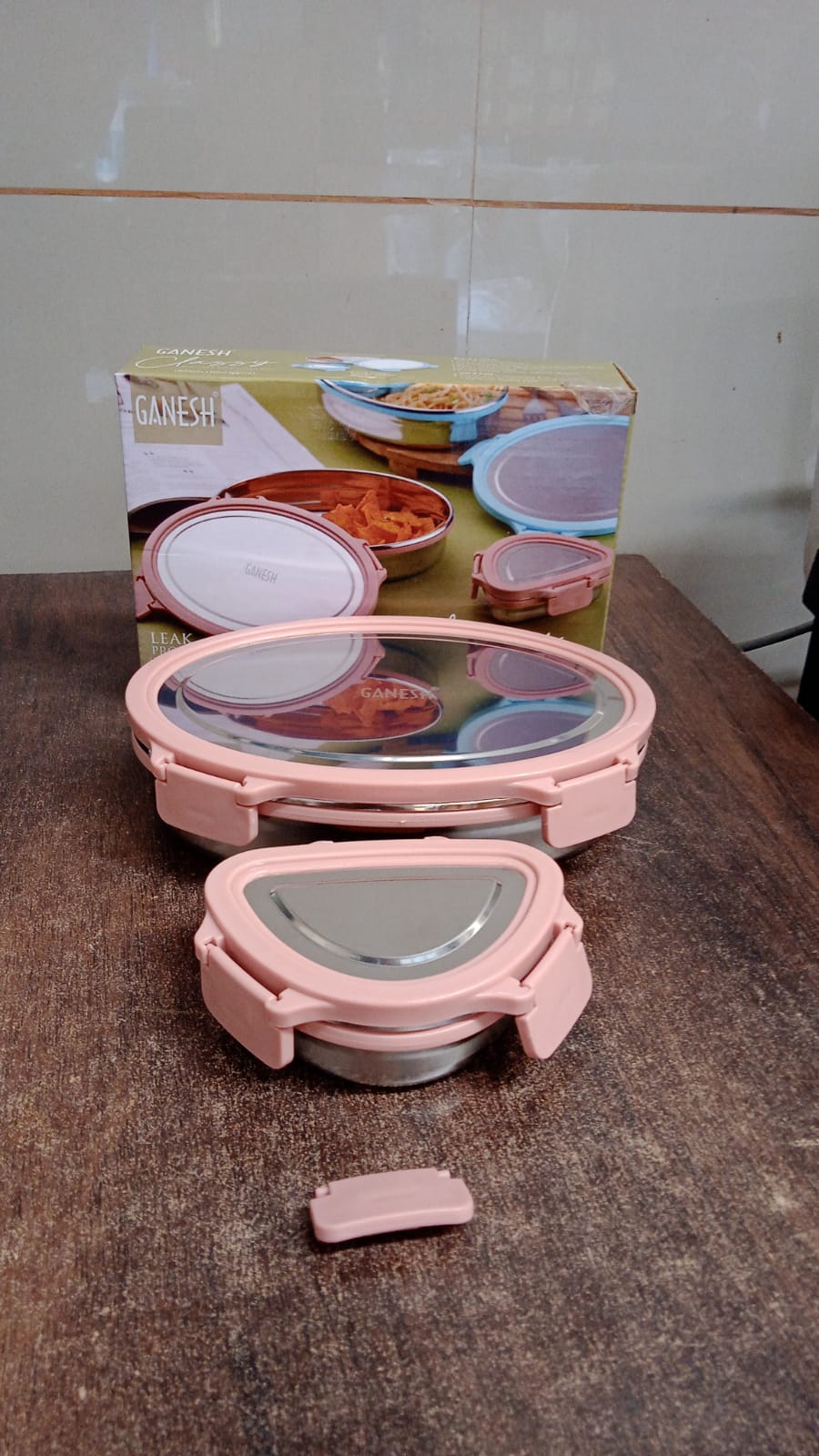 Ganesh Classy 2-Piece Stainless Steel Lunch Box Set – Elegant Oval & Triangle Leakproof Containers with Lock Clip Lids, Compact & Durable for Office, School, and Travel Use